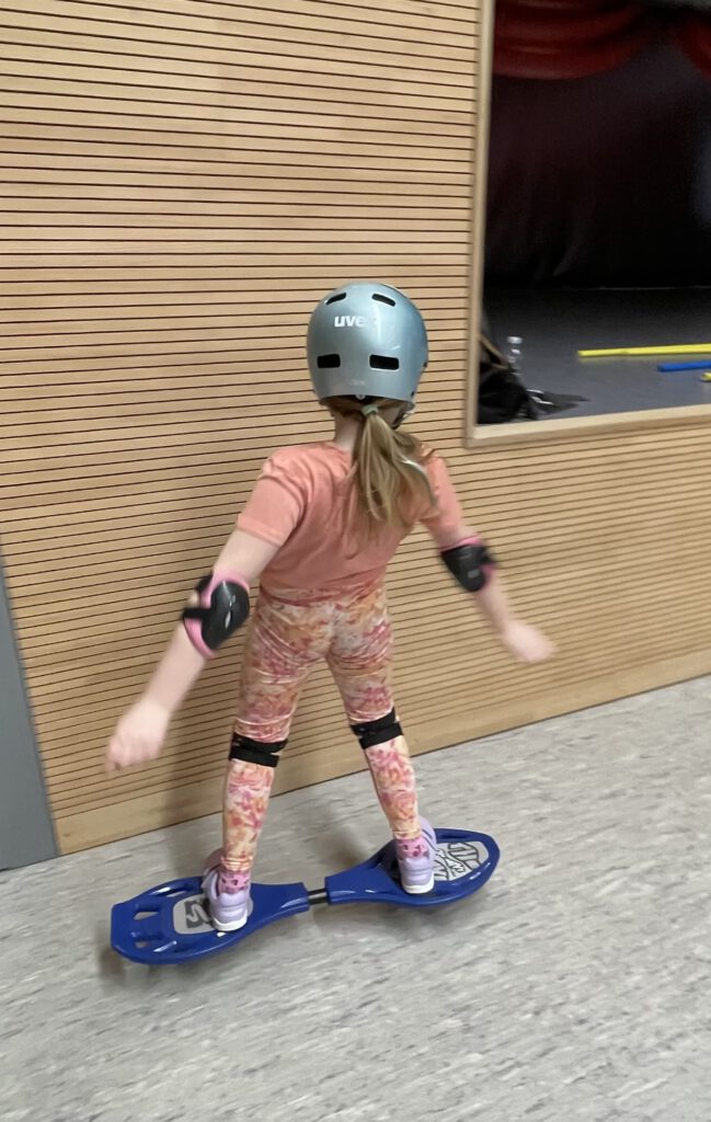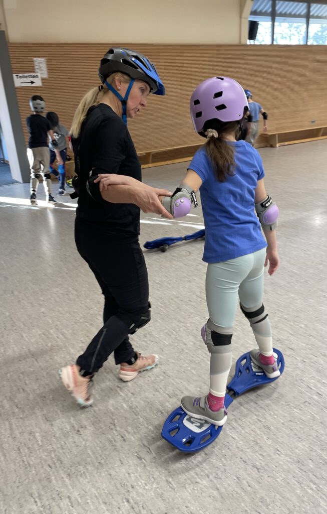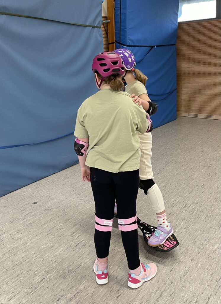 In der ersten Kurseinheit lag der Fokus darauf, sich an das neue Sportgerät zu gewöhnen und die Schutzausrüstung richtig anzupassen. Die Kinder übten in Zweierteams mit den bereitgestellten Waveboards. Sie lernten, wie man aufsteigt, Kurven fährt und das Gleichgewicht hält. Der Gleichgewichtssinn wurde gefordert, und allen machte es großen Spaß! Besonders schön war zu beobachten, wie die Kinder sich gegenseitig unterstützten und Vertrauen aufbauten. Diese erste Einheit war somit nicht nur sportlich, sondern auch emotional und sozial ein großer Erfolg.